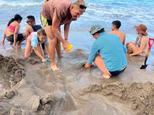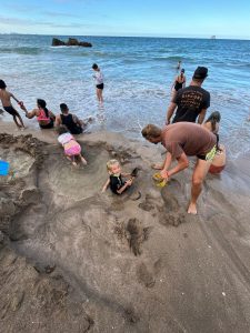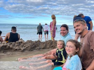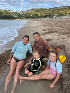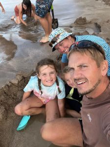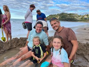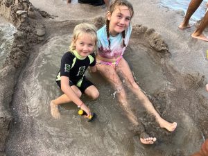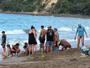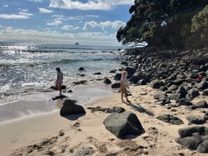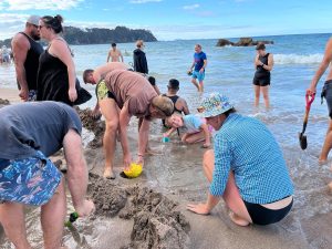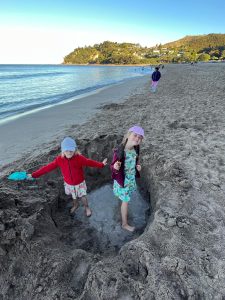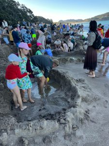 Tak jako si člověk v ČR člověk plánuje čas podle autobusů, vlaků, zvonění ve škole apod., tady se to měří na čas vrcholu přílovu a odlivu. A protože ten se s našimi časy zmrzliny, trhy a skoky do písku ne a ne sladit, první noc jsme u Hot Water Beach pouze přespávali a čekali na příležitost další den. Byl to snad první den na NZ, který jsme strávili ležením na pláži a na jednu stranu to má taky něco do sebe, i když se musím přiznat, že kolem čtvrté, už mě to postupně přestávalo bavit. Ale holky byly nadšené z dun a skal kolem, takže jsem poslušně čekala na naší šanci. A kolem páté odpoledne to přišlo. Najednou na pláži, kde nikdo do té doby skoro nebyl, se začali objevovat lidé s lopatami, lopatkami, kyblíky a všemožným nářadím.